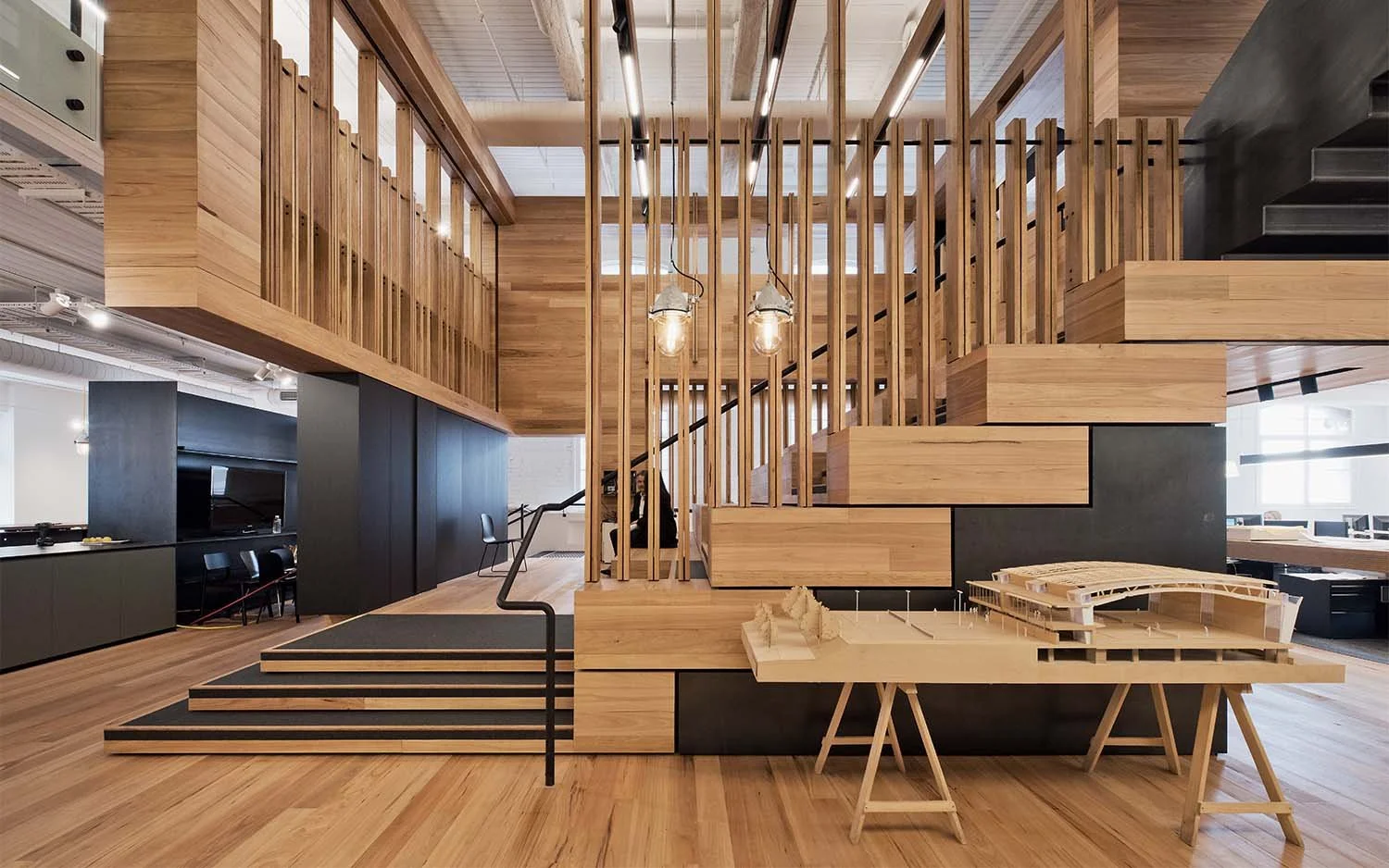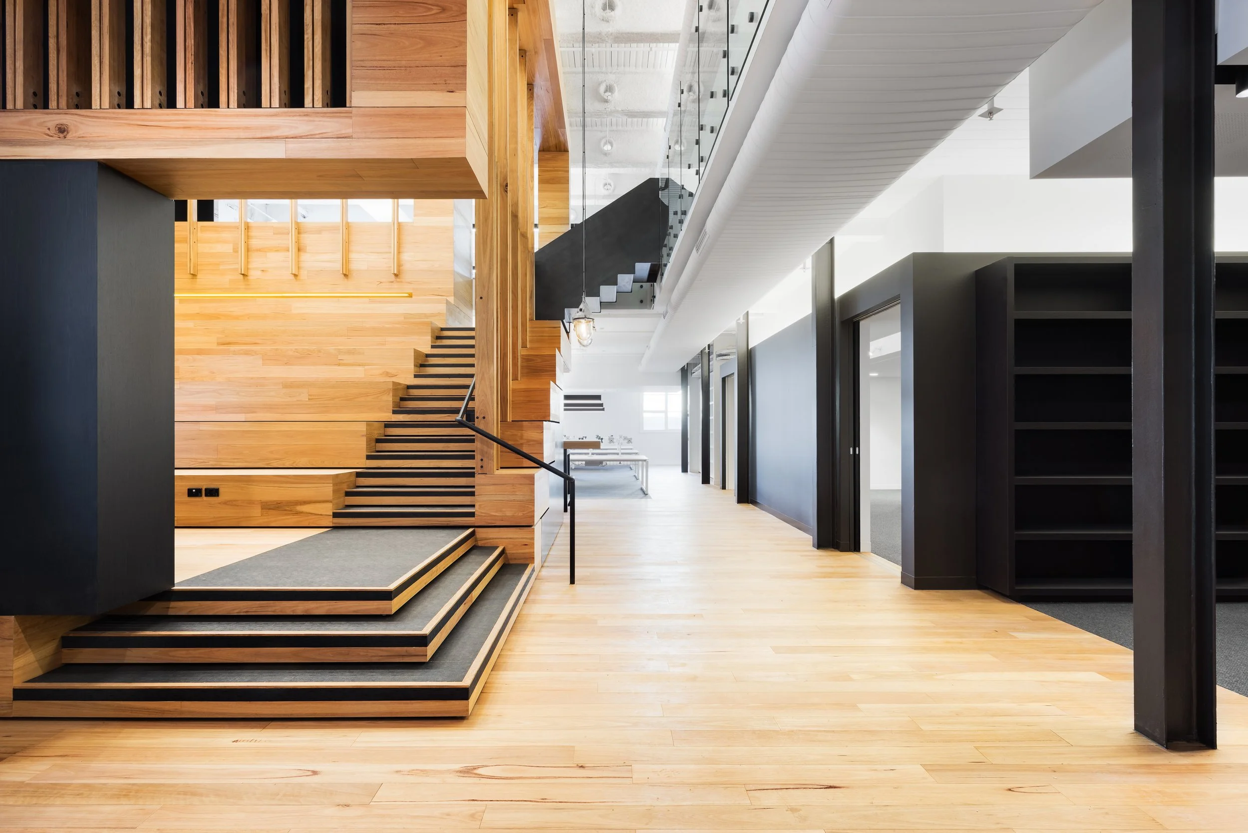 A complete office fit-out, cut-out demolition between two tenancy floors, a services upgrade and the construction of a detailed tiered feature auditorium for both in-house and client media presentations.